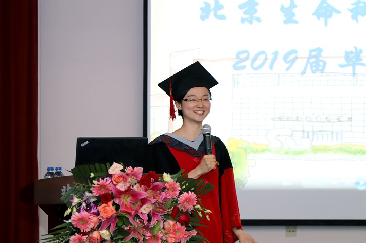 毕业生代表于宙同学在典礼上发言。她代表同学们,表达了对研究所老师们、同学们及后勤工作人员们的感激之情,同时也祝愿同学们不负青春,无问东西,未来人生路,勇于实现个人价值。