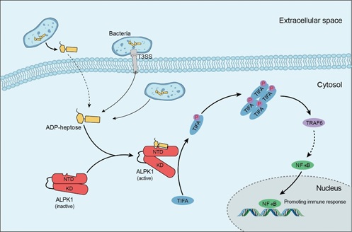 此前的研究显示,包括耶尔森菌和肠致病性大肠杆菌在内的诸多革兰氏阴性致病菌可借助其三型分泌系统(T3SS)激活宿主NF-κB信号通路,但具体分子机制并不清楚。为此,邵峰实验室的研究人员通过转座子介导的细菌遗传筛选及生物化学分析的方法,发现细菌中的七碳糖代谢中间产物ADP-heptose(二磷酸腺苷庚糖)介导了细菌三型分泌系统依赖的NF-κB通路的激活及炎症细胞因子的产生。ADP-heptose广泛存在于几乎所有的革兰氏阴性细菌及部分革兰氏阳性菌中。在非感染的情况下,将ADP-heptose直接添加至细胞培养基中,即可明显激活宿主细胞内NF-κB通路。为进一步研究细胞感知ADP-heptose的分子机制,研究人员在人胚肾细胞系中进行了基于流式细胞分选的CRISPR-Cas9全基因组筛选,最终发现了ALPK1-TIFA信号通路对于ADP-heptose激活NF-κB是必需的。ALPK1是细胞质内的一个激酶,包含N-端结构域和C-端激酶结构域,中间由一个长柔性序列相连。经过一系列的生物化学实验分析,研究人员发现ALPK1的N-端和C-端结构域之间具有组成性的相互作用,并且ALPK1的N-端结构域可以直接结合ADP-heptose,通过蛋白构象变化诱导C-端激酶结构域活化,进而磷酸化TIFA。磷酸化后的TIFA发生寡聚,并进一步通过与TRAF6的相互作用激活下游NF-κB通路。研究者还测定了ALPK1 N-端结构域和ADP-heptose的复合物的晶体结构,解析了ALPK1受体识别ADP-heptose的精确机制。