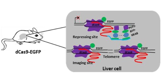 到目前为止,dCas9/gRNA工具主要通过转染或病毒感染的方法将dCas9,gRNA以及相应的效应蛋白导入体外培养的细胞中。然而,dCas9/gRNA在活体动物中的体内应用仍然受到较多限制,如何有效地将所有这些组分,尤其是大的dCas9表达质粒送到各种组织的细胞中仍然是一个主要的困难。为了解决这一问题,张昱实验室研究人员构建了全身表达dCas9-EGFP的小鼠 (Figure 1)。通过该小鼠,研究人员首次观察并记录了活体动物中端粒的动态。张昱实验室研究人员还开发了CRISPRimaging-interference (CRISPRii)系统,实现了在活体动物体内抑制TRF1表达的同时,记录端粒位点的动态 (Figure 2),通过该系统,研究人员观察到抑制TRF1(一种shelterin蛋白)的表达会显著地影响端粒动态变化,这与以往报道一致,并且该表型可以被过表达TRF1恢复。