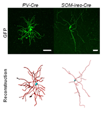 组织透明化是近期成像领域屡有突破的技术。研究人员将稀疏标记系统与组织透明结合,在PV-Cre和SOM-ires-Cre小鼠中特异性的标记了两类中间神经元,制成脑片后用uDISCO方法进行透明化处理。随后在共聚焦显微镜下成像,并对对神经元进行了重构。通过此方法,研究人员实现了中间神经元的快速重构,并且可以高效地对神经元树突的分支特征进行量化分析(图四)。