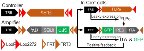 这两个病毒需混合后进行脑内注射。混合病毒侵染神经元后,若神经元内无Cre表达,则标记不发生。当病毒感染Cre阳性神经元后,控制子中的Cre依赖的转录元件会被翻转。由于此时神经元内没有tTA表达,TRE启动子转录活性低。在大多数被病毒侵染的Cre阳性神经元中FLPo表达量极低,无法触发放大子中FLP依赖的转录模块的翻转。随机的,在某些Cre阳性神经元中,FLPo表达量达到一定的水平,触发放大子中FLP依赖的转录模块的翻转。由于放大子同样使用TRE启动子,转录活性低,只有少量的GFP和tTA表达。此时,在极少量细胞内tTA的表达量达到一定水平,足以结合TRE启动子并启动其后基因的转录,正反馈回路被触发:细胞表达更多的FLPo对剩余的放大子组件进行翻转,并使更多的GFP和tTA被表达出来,标记强度得到增强(图1右)。