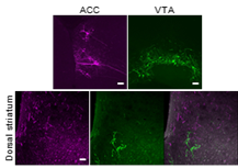 基于这一标记系统,罗敏敏课题组与华中科技大学国家光电研究中心fMOST课题组合作,建立了“稀疏标记-样本包埋-fMOST成像-神经元重构-数据校准-量化分析”的流水线,实现了稳定高通量的全脑成像和图像分析。借助这一流水线,研究人员在DAT-Cre小鼠中重构了15个中脑多巴胺神经元的完整形态。通过单细胞形态学分析,研究人员能够将重构的多巴胺神经元分为两类:一类多巴胺神经元只有单个投射目标,轴突在终点处会形成密集的末端树状分支(图二左);另一类投射轴突分布比较广泛,会有多个旁分支投向不同目标,少有末端树状分支(图二右)。