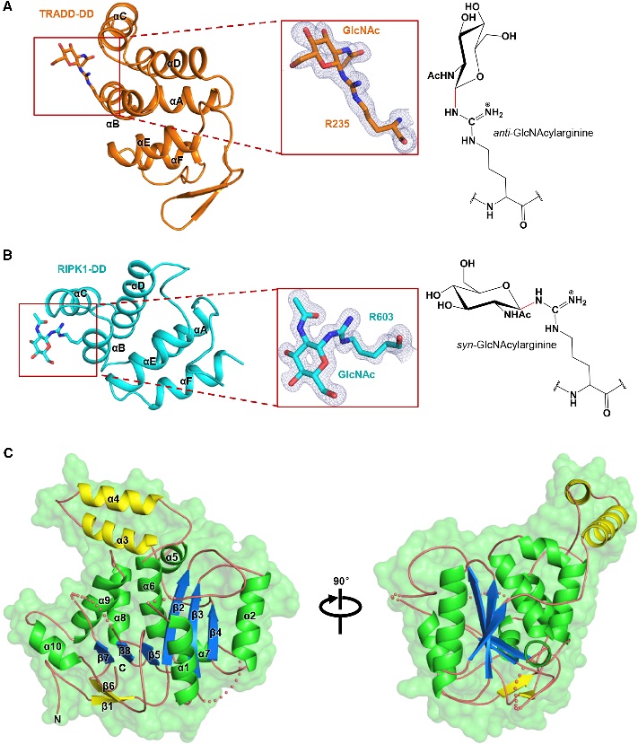 图1:NleB和被NleB糖基化修饰后的TRADD和RIPK1的死亡结构域的晶体结构