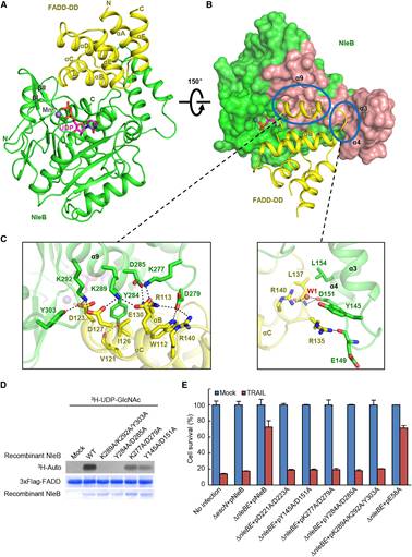 图2:NleB/FADD-DD复合物的晶体结构和对相互作用界面的功能分析