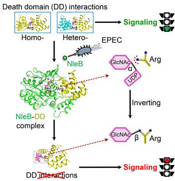 早在2013年,邵峰团队在《Nature》杂志上报道,肠致病性大肠杆菌通过三型分泌系统效应蛋白NleB阻断宿主死亡受体信号通路,帮助病原菌在肠道内定植和感染,NleB具有糖基转移酶活性,特异性地糖基化修饰(N-乙酰葡萄糖氨,GlcNAcylation)宿主死亡受体通路中死亡结构域上的一个关键精氨酸,进而阻断死亡结构域的相互作用和信号复合体的组装;这种发生在精氨酸上的GlcNAcylation不同于常见的各种糖基化修饰,是一种全新的蛋白质翻译后修饰。但是NleB如何特异地识别宿主靶蛋白死亡结构域进而实现精氨酸GlcNAcylation的分子机制一直不清楚。