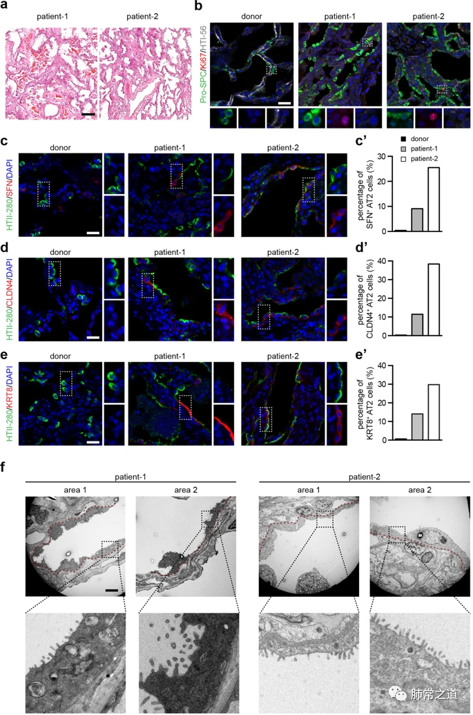 本研究分析了两名COVID-19患者的移植肺,患者1是58岁男性,患者2是54岁男性。感染前,两名患者均健康无慢性肺病。经过对两名患者的肺组织进行分析,发现在肺泡腔中有很多脱落的细胞团和透明膜,间质区域存在纤维化特征,表明患者均呈现严重的弥漫性肺泡损伤(图1a);此外还有大量的AT1丢失和AT2聚团现象,其中一些AT2细胞呈现增殖状态(图1b),该结果表明在SARS-CoV-2诱导的肺损伤后,肺泡干细胞AT2能够进行自我复制。