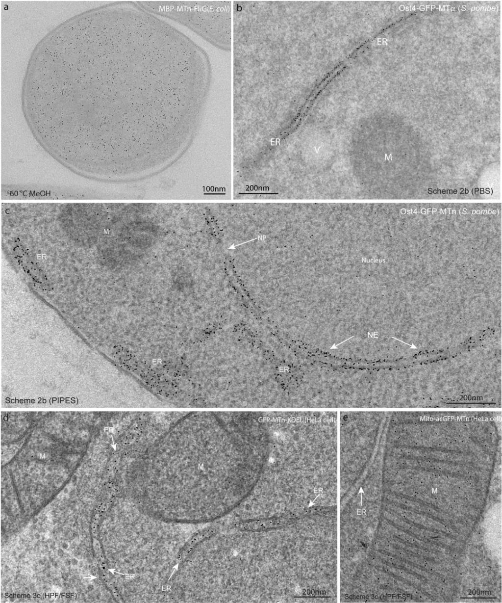 a.表达MBP-FliG-MTn的大肠杆菌中合成纳米金颗粒。b.表达Ost4-GFP-MTα的酵母细胞中纳米金颗粒特异性定位于内质网膜(ER)上。c.表达Ost4-GFP-MTn的酵母细胞中纳米金颗粒特异性定位于核膜和内质网膜(ER)上。d.稳定表达GFP-MT-KDEL的HeLa细胞中纳米金颗粒特异性定位于内质网(ER)内腔中。e.稳定表达Mito-acGFP-MTn的HeLa细胞中纳米金颗粒特异线粒体(M)基质中。