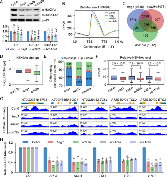在拟南芥SAGA复合体中,SCS1/2A/2B突变会导致与保守亚基HAG1和ADA2B突变类似的发育缺陷,包括幼年期至成年期转换滞后、延迟开花以及叶片毛状体密度增加等。通过RNA-seq发现植物特异亚基SCS1/2A/2B与保守亚基HAG1和ADA2B能够共同控制大量基因的表达,其中包括控制发育阶段转换和开花时间的基因SPL3和SOC1以及控制叶片毛状体发育的基因TCL1、TCL2和ETC2等。此外,利用ChIP-seq在全基因组水平检测了各突变对组蛋白乙酰化修饰的影响,发现植物特异亚基SCS1/2A/2B与保守亚基HAG1和ADA2B共同通过影响组蛋白H3的乙酰化水平调控发育相关基因的转录(图2)。SCS1/2A/2B是SAGA复合体在组蛋白乙酰化修饰过程中发挥功能所必需, 同时也是乙酰基转移酶HAG1被招募到发育调节基因上所必需。