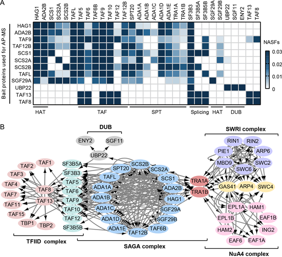 图1.利用AP-MS鉴定拟南芥中SAGA复合体的亚基组成