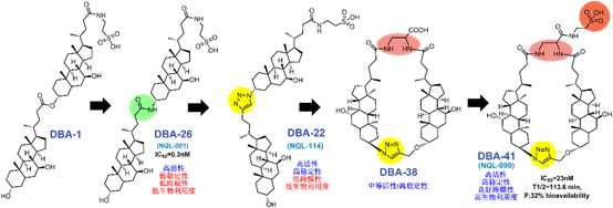 该研究中,作者偶然发现了熊去氧胆酸(TUDCA)聚合而成的二聚胆酸衍生物(DBAD)具有高效抑制NTCP功能的活性,而不同连接形式的二聚体产生的抑制效果显著不同。基于具有活性的二聚体结合模式,作者进一步设计并合成了上百种不同链接方式,不同骨架和不同构型的二聚胆酸分子。通过进行抑制乙肝病毒感染实验,作者对这些化合物进行了详细的结构-活性关系(SAR)研究,发现了具有高活性和高持续性抑制NTCP功能的胆酸二聚体。此外,该研究还发现NTCP氨基酸序列157–165片段可能与二聚胆酸的结合有关,并造成了二聚胆酸对于不同种属NTCP抑制能力上的差异。研究团队接下来通过优化[AB-MPS]数值,针对性地构建优势环系骨架,刚性构型和优势官能团等策略,对二聚胆酸衍生物进行了深入的成药性优化。并最终得到了对人NTCP具有高度选择性,高亲和力和优良生物利用度的强效化合物DBA-41(NQL-90)。对其在人NTCP敲入小鼠中的体内功效研究中表明,DBA-41能够影响人NTCP敲入小鼠体内的胆酸水平,但在给药过程中小鼠的丙氨酸转氨酶(ALT)水平或体重均未观察到差异。这些结果证明了DBA-41在抑制NTCP底物摄取方面的体内功效,同时显示出良好的安全性,具有被开发为HBV感染抑制剂的潜力。