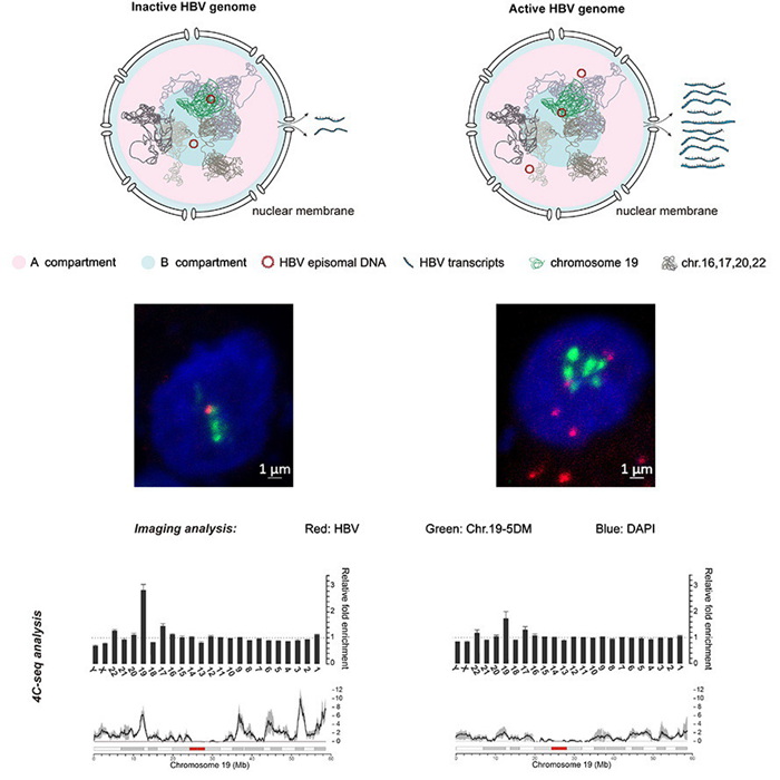 /北京生命科学研究所李文辉实验室在《Cell Reports》杂志发表题为“Transcriptionally Inactive Hepatitis B Virus Episome DNA Preferentially Resides in the Vicinity of Chromosome 19 In 3D Host Genome Upon Infection”的研究论文。论文报告了HBV感染肝细胞后,细胞核内病毒DNA分子在宿主3D基因组中的分布特点,发现非活跃转录的病毒DNA分子优先富集在核内19号染色体附近等区域。