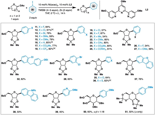 /北京生命科学研究所李超实验室(www.lichaolab.com)开发了一种以稳定易得的1-乙酰呋喃糖和芳基碘化物为原料高效制备C-芳基核苷类似物的新方法。该方法以“Chemoselective and Diastereoselective Synthesis ofC-Aryl-Nucleoside Analogues by Nickel-Catalyzed Cross-Coupling of Furanosyl Acetates with Aryl Iodides”为标题发表在 Angew. Chem. Int. Ed.上。这个金属镍催化的亲电交叉偶联反应具有反应条件温和、底物范围广、b选择性好、官能团兼容性强等优点。