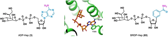 ADP-β-D-manno-heptose (ADP-Hep) 是一种天然产物,最初于20世纪80年代从一种革兰氏阴性菌中分离出来。在生源上,ADP-Hep 可以为革兰氏阴性菌细胞外壁中脂多糖(LPS)的合成提供庚糖前体。2018年,北京生命科学研究所邵峰课题组发现宿主细胞质内的激酶ALPK1(alpha-kinase 1)可以特异性识别ADP-Hep,进而激活NF-κB通路介导的天然免疫反应(Nature, 2018, 561, 122)。并且发现ADP-Hep具有自主进入哺乳动物细胞的能力,这也为开发新的免疫调节剂提供了新的概念和方法。李超课题组在ALPK1N-端结构域和ADP-Hep共晶结构的基础之上设计了一种新型ADP-Hep的C-核苷酸类似物BRDP-Hep。