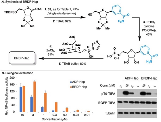 之后,李超课题组利用上述开发的C-核苷类似物的合成方法成功合成了BRDP-Hep。值得注意的是,荧光素酶报告质粒系统和凝胶电泳实验表明,BRDP-Hep显示出比ADP-Hep更强的生物活性,激活NF-κB和磷酸化TIFA的能力明显增强。
