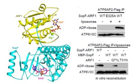 2022年1月19日,北京生命科学研究所邵峰实验室和中科院生物物理所丁璟珒实验室合作在Nature Structural & Molecular Biology上发表了题为 ARF GTPases activateSalmonellaeffector SopF to ADP-ribosylate host V-ATPase and inhibit endomembrane damage-induced autophagy的研究成果。该研究揭示了SopF挟持真核细胞ARF GTPase发挥毒力作用的分子机理,并阐明了V-ATPase-ATG16L1通路响应内膜系统损伤而激活LC3的通用机制。