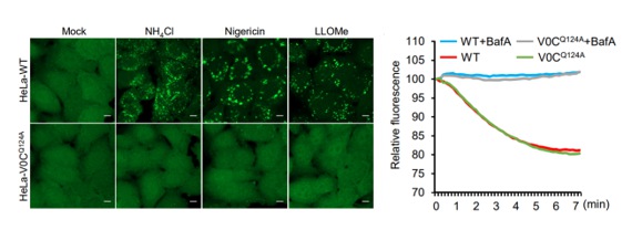 图 2VOC Gln124突变抑制溶酶体损伤引起的LC3激活(左)与体外V-ATPase质子泵活性实验(右)
