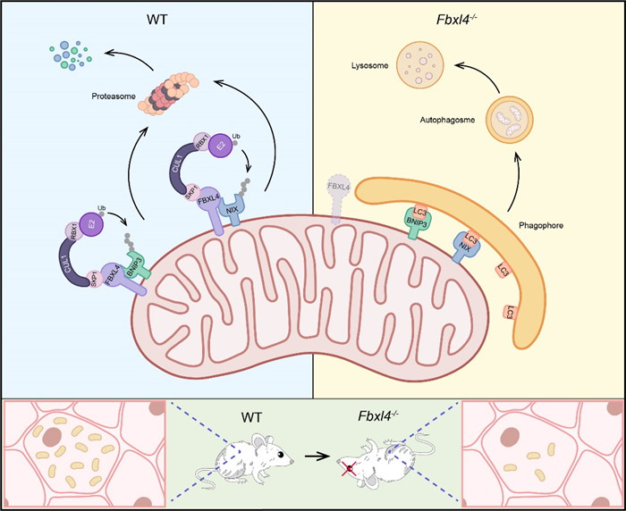 FBXL4缺失过度激活BNIP3和NIX依赖的线粒体自噬,造成线粒体数量减少和小鼠死亡。