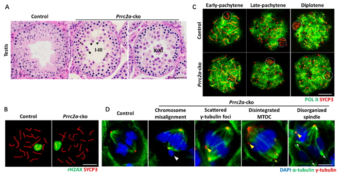 2019年,袁增强、杨运桂、王凤超实验室合作报道了PRRC2A是一种新型m6A阅读蛋白及在脑发育中的作用[2]。本研究中,研究人员通过qPCR、WB、RNA杂交及免疫荧光染色,发现PRRC2A在睾丸中有更高表达,主要存在于减数分裂晚前期(late prophase)精母细胞及圆形精子中。作者利用Stra8-Cre在小鼠雄性生殖细胞中特异敲除Prrc2a基因,发现会导致小鼠不育。PRRC2A缺失后,小鼠睾丸中缺少长形精子、圆形精子数量明显下降且表现为异常核型并脱落(图1A)。TUNEL染色显示,PRRC2A缺失会导致细胞凋亡从减数分裂前期的粗线期开始显著增多,在中期精母细胞与圆形精子阶段发生大量凋亡。更详细的表型分析显示,PRRC2A-null减数分裂前期精母细胞中,XY染色体不联会比例显著提高(图1B),减数分裂性染色体沉默(MSCI)现象被破坏(图1C)。PRRC2A-null减数分裂中期精母细胞中,染色体着丝排板异常、微管组织中心定位异常且破碎、出现不对称或多级纺锤轴现象(图1D)。