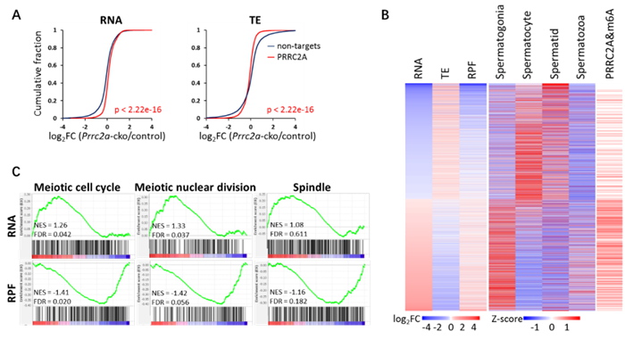 结合RNA-seq、Ribo-seq、PRRC2A RIP-seq结果,研究人员发现PRRC2A的结合峰主要位于mRNA的CDS与3’UTR区域,高度富集于终止密码子附近,且能够富集出GGACU motif,这些特征与m6A修饰的分布特征类似[3, 4],说明PRRC2A在雄性生殖细胞中也发挥m6A阅读蛋白的功能。在精母细胞中,PRRC2A缺失会导致靶标mRNA的丰度上升及翻译效率(TE)下降(图2A),说明PRRC2A具有促进mRNA降解和/或翻译的功能。