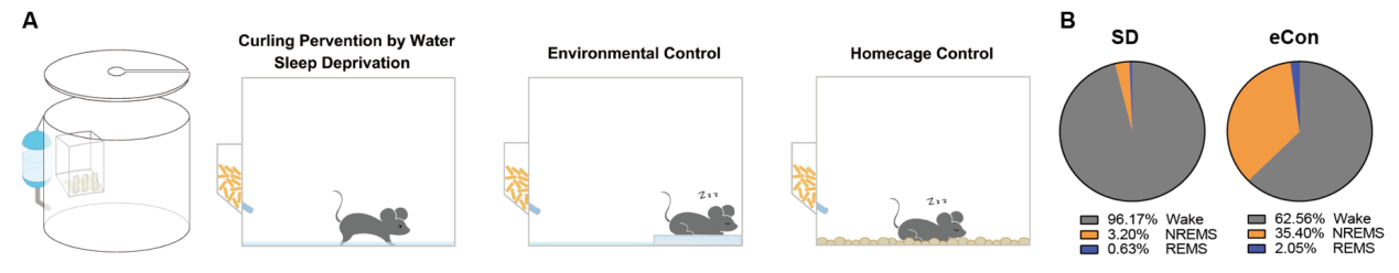 在此研究课题中,张二荃实验室研究人员首创了一套适用于小鼠的定名为“Curling Prevention by Water”(CPW)的睡眠剥夺系统(图一),通过脑电图/肌电图(EEG/EMG)记录实验组小鼠和对照组小鼠的睡眠/觉醒情况,确认该系统可以持续剥夺小鼠95%以上的睡眠。该系统相较于传统的实验动物转杆睡眠剥夺系统(Stand Alone Sleep Deprivation,SASD),可以在不引入更多环境刺激和保证实验通量的基础上极大提高睡眠剥夺效率,从而帮助研究人员可以观察到长时间睡眠剥夺后对哺乳动物带来的生理后果。