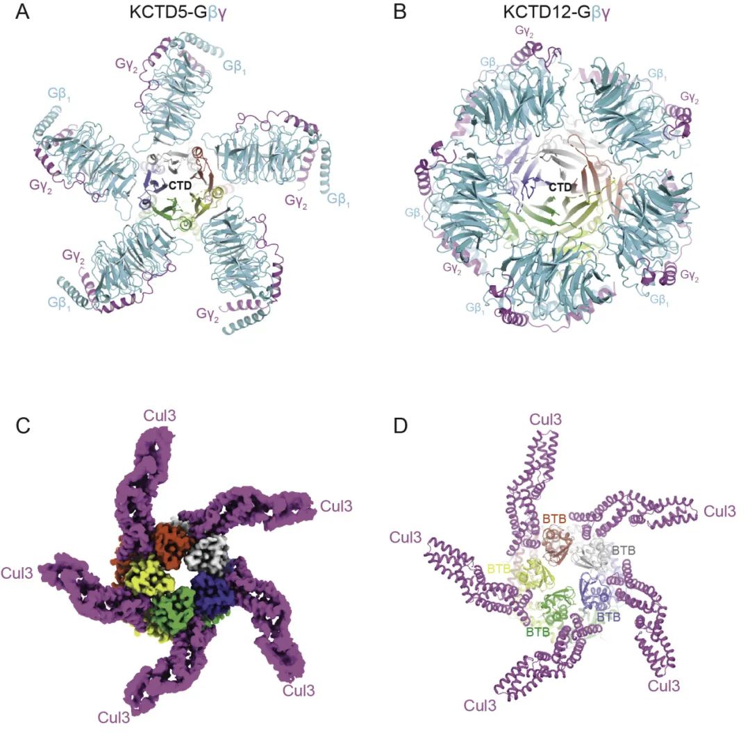 KCTD5和KCTD12招募Gβγ的特点。A, KCTD5 CTD与Gβγ复合物的冷冻电镜结构。B, KCTD12 CTD与Gβγ复合物的晶体结构(1)。C, KCTD7 BTB与Cullin-3的冷冻电镜结构密度图。D, KCTD7的BTB结构域与Cullin-3的结构。