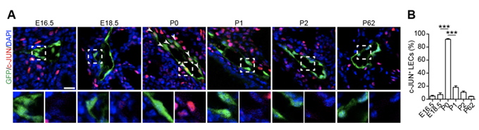 /北京生命科学研究所汤楠实验室在Proceedings of the National Academy of Sciences杂志在线发表了题为“c-JUN-mediated transcriptional responses in lymphatic endothelial cells are required for lung fluid clearance at birth”的研究论文。该研究发现新生小鼠的肺淋巴管内皮细胞(lymphatic endothelial cells)在出生后(postnatal day 0, P0)短暂性高表达转录因子c-JUN,并揭示了c-JUN介导的转录反应通过调控淋巴管的“吸水”功能,促进出生后肺部液体的快速清除。