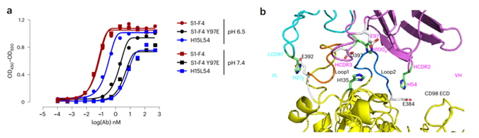 为了合理改造S1-F4,研究者首先解析了S1-F4/CD98的晶体结构。基于晶体结构信息,定向增加结合表位中组氨酸(H)和天冬氨酸(D)或谷氨酸(E)的相互作用,逐步获得了具有良好pH依赖性的抗体H15L54(图1)。