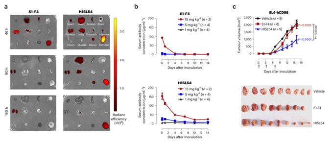c. S1-F4和H15L54在荷载EL4-hCD98的CD98人源化小鼠中的治疗效果。