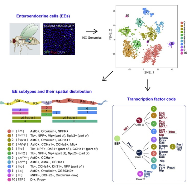细胞的多样性是多细胞生物的基本特征,也是发育生物学中的重要命题之一。除了细胞类型的多样化,同一类型细胞多种亚型的存在更是丰富了细胞多样性。经典的代表包括B、T淋巴细胞通过V(D)J重排原理实现淋巴细胞的多样化;嗅觉神经元通过染色质的3D调控使得每一个神经元只表达一个不同的、经过独特剪接而形成的嗅觉受体;而神经系统中的很多神经元通过不同时空表达的转录因子及其组合决定了神经元的多样化。肠内分泌细胞(Enteroendocrine Cell,EE)散在分布于消化道的上皮中,在哺乳动物和果蝇中均有至少10种亚型。它们通过感知外界信号刺激,分泌多种神经肽和神经递质,调节肠道蠕动、消化吸收、食欲、糖脂代谢等多种重要的生理过程。近期一系列结合了单细胞组学的技术的研究,有力地促进了对EE各亚型神经肽表达特征的认识及相关转录因子的发现,然而决定EE细胞多样性的分子遗传原理仍不清楚。