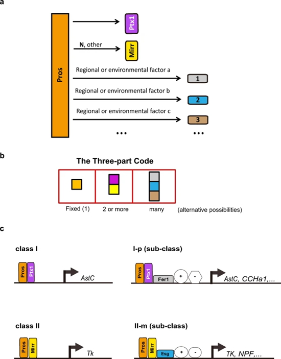 因此,本项研究揭示了一个具有调控层级和功能层级关系的转录因子组合,编码了果蝇肠内分泌细胞的多样性(图4)。Pros是唯一的第一层级的转录因子;第二层级的转录因子至少有2个;而第三层级的转录因子有12个以上。因此,这三部分的自由组合在理论上可以产生至少24种EE亚型,也使任何一种EE亚型具有动态的神经肽的表达类型和模式的可能性。