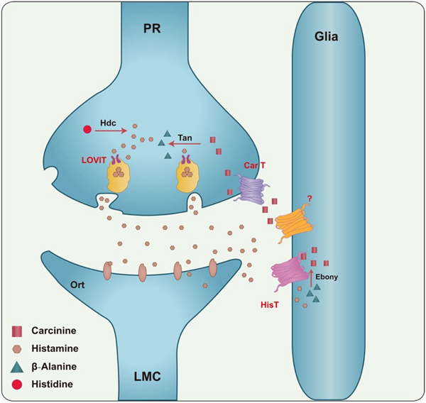 图2. 果蝇视觉系统中组胺的神经元/神经胶质细胞循环。