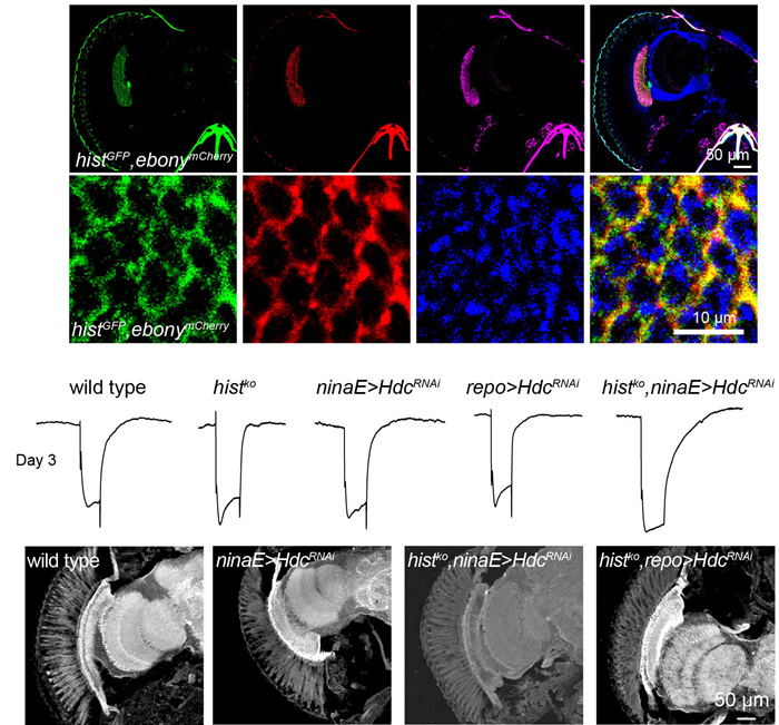 图1. HisT位于胶质细胞中,参与调控组胺的神经元/神经胶质细胞循环。