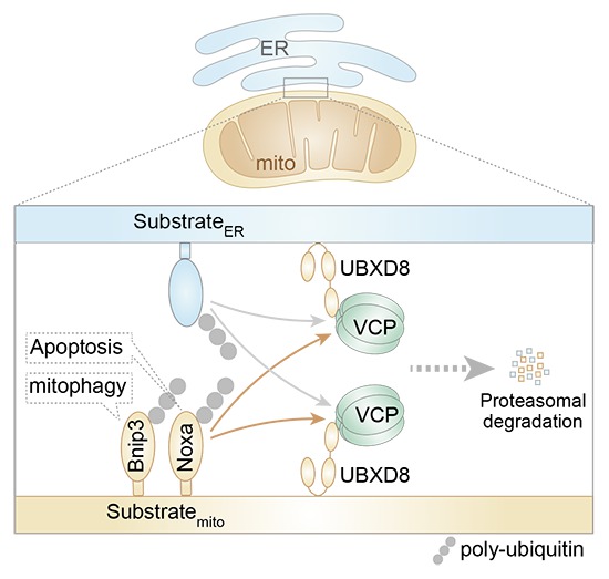 图1. UBXD8介导线粒体和内质网蛋白降解,抑制凋亡和线粒体自噬的模式图