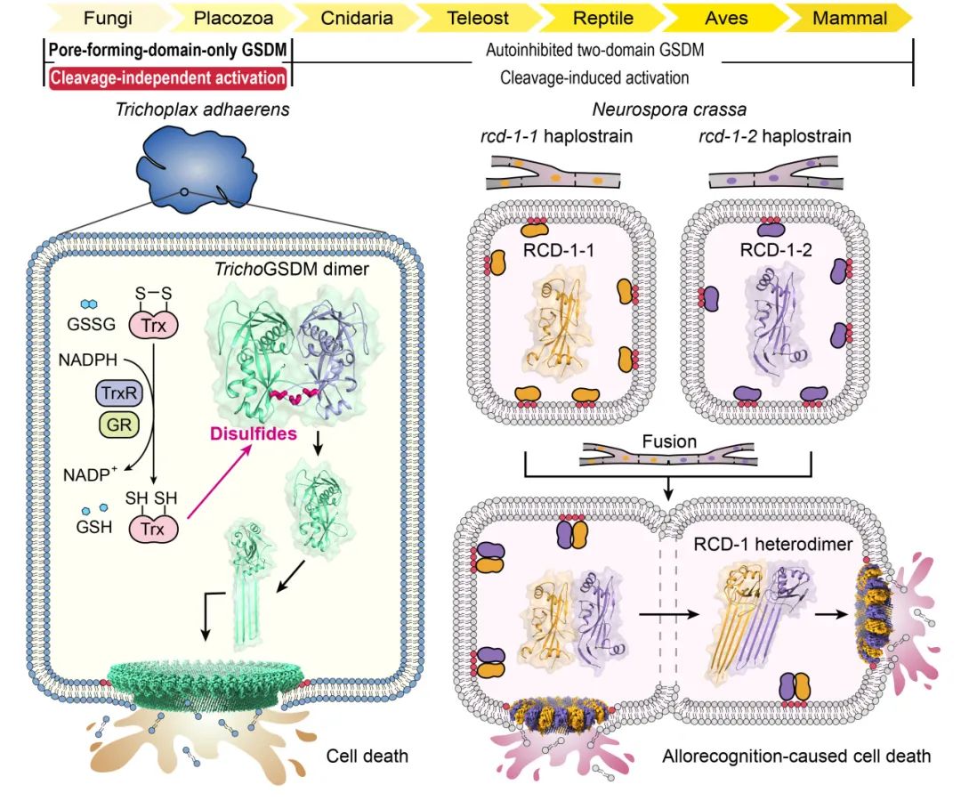 图:低等真核生物丝盘虫和粗糙脉孢菌编码只含有膜打孔结构域的GSDM蛋白,通过非蛋白酶切割的新颖方式激活膜打孔活性,执行细胞死亡的功能。