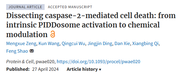 /北京生命科学研究所邵峰团队在Protein & Cell杂志在线发表题为"Dissecting caspase-2-mediated cell death: from intrinsic PIDDosome activation to chemical modulation"的研究论文,证明了由PIDDosome激活的caspase-2可以直接切割BID分子,激活下游的线粒体内源凋亡通路。此外,在化合物筛选中发现了caspase-2的小分子激动剂HUHS015,并揭示了其直接激活caspase-2的关键作用位点。