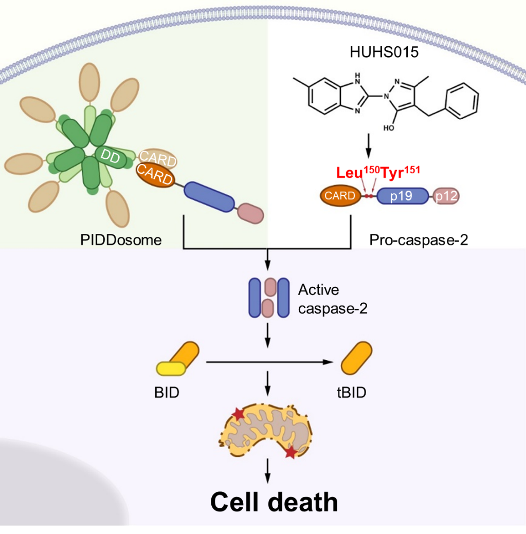 本研究通过在Jurkat和HL-60细胞中条件性表达PIDD1-CC,诱导PIDDosome形成激活caspase-2,细胞发生明显的凋亡。通过无偏倚的全基因组遗传筛选,确定了Bcl2家族蛋白中的BID分子在PIDDosome诱导caspase-2激活的细胞凋亡中的关键作用。此外,在化学筛选中发现的小分子HUHS015,可以特异性激活caspase-2介导的细胞凋亡。HUHS015系列化合物作为caspase-2的激动剂,直接靶向caspase-2的CARD结构域后的功能未知序列,其中L150Y151被确定为关键作用位点。这项发现颠覆了传统认知,即启动型caspase利用N-末端CARD结构域来感知上游的激活信号的观点。人和小鼠的caspase-2有两个关键残基的差异,使得HUHS015只能特异性地作用于人的caspase-2。在caspase-2人源化小鼠上,我们可以利用HUHS015系列衍生物研究caspase-2在重要生理和病理过程中的功能。研究还发现,在许多人类癌细胞中广泛表达caspase-2,这使得利用HUHS015系列化合物激活caspase-2介导的细胞死亡成为一种可能的治疗癌症的策略。此外,研究报道CASP2,RAIDD和PIDD1中的双等位基因致病突变与无脑回畸形(LIS)相关,小分子激动剂的发现也为此类caspase-2相关疾病的小分子药物的开发提供了新的思路。