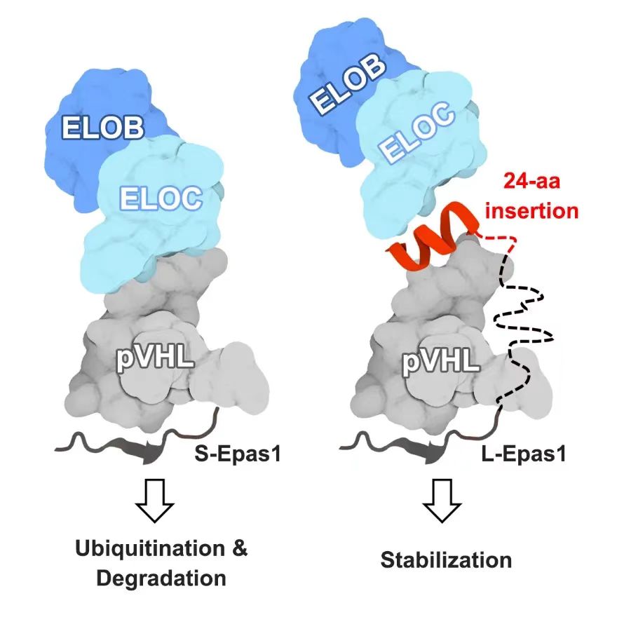 2022年,张二荃实验室在高原鼠兔(Ochotona curzoniae)的Epas1(Hif2a)基因中发现了一个物种特异性的突变,该突变导致Epas1的转录本在第14和15个外显子之间增加了72个碱基,从而使其翻译产物增加了24个氨基酸,该插入片段提高了蛋白质的稳定性,扰乱了高原鼠兔的昼夜节律并提高了高原鼠兔对低氧环境的耐受性(Liu et al., Cell Rep, 2022)。然而,该段插入序列导致Epas1稳定性增加的机制并不清楚。
