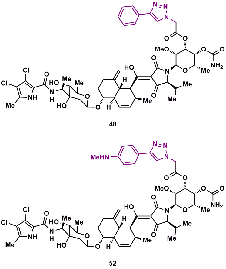 在此项工作,作者首先对AMM/KBD的复杂结构进行了简化。抗菌活性评价表明,AMM/KBD分子中的五个片段(A/B/C/D/E)对其强效抗菌活性的保持都具有十分重要的作用,尽管片段A的脱除对AMM/KBD抗革兰氏阳性菌活性的影响相对较小(MICs = 24 g/mL)。其次,作者结合KBD与靶蛋白的共晶结构,对AMM/KBD的五个片段(A/B/C/D/E)分别进行了多位点的化学修饰。在对片段E的化学修饰过程中,作者发现了两个抗鲍曼不动杆菌(包括对碳青霉烯耐药的鲍曼不动杆菌)活性提高2倍的类似物(MICs由48 g/mL降低至24 g/mL)。这表明,对片段E的化学修饰有望开发出抗鲍曼不动杆菌活性更强的类似物。在对片段A中的乙酰基进行化学修饰过程中,作者利用CuAAC反应引入了多种芳香基团,以期来干扰靶标蛋白的二聚化,最终发现了一个与AMM/KBD抗革兰氏阳性菌活性相当的类似物48 (MICs = 0.252 g/mL),以及一个抗革兰氏阳性菌活性显著提高的类似物52 (MICs = 0.1251 g/mL)。这些结果表明,AMM/KBD片段A中的乙酰基具有良好化学修饰潜力,通过对该位点进行修饰,极有可能开发出活性更强的类似物。