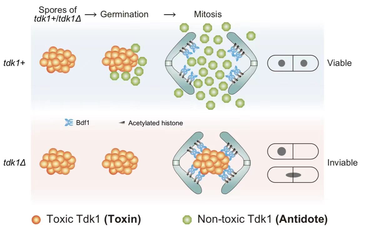 综上所述,曾被误认为是“必需基因”的tdk1基因,实际上是一种杀手减数分裂驱动因子。该基因通过所编码蛋白的两种不同构象,构建了一个“毒药–解药”系统。在tdk1+/tdk1Δ杂合二倍体减数分裂时,所有后代孢子中都产生了Tdk1的毒性构象。在不携带tdk1基因的后代中,Tdk1毒性构象持续存在,并通过劫持组蛋白结合蛋白破坏孢子萌发后的有丝分裂,从而造成杀伤;而在携带tdk1基因的后代中,新合成的Tdk1作为“解药”中和先前形成的Tdk1“毒药”,保护细胞免受杀伤(图4)。这些研究成果不仅发现了一种新的杀手减数分裂驱动因子,还阐明了其独特的杀伤机制,首次揭示单一蛋白能通过可变蛋白结构组成“毒药–解药”系统。这些发现对深入理解减数分裂驱动现象具有重要意义。