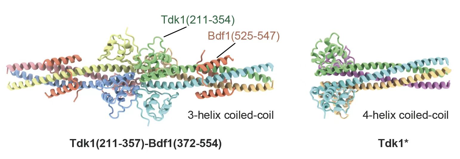 对裂殖酵母天然菌株中的 tdk1 基因的分析发现了一种失去杀伤能力的 HT3 变体,它带有六个氨基酸变异。通过有性生殖阶段的邻近标记实验,研究人员发现乙酰化组蛋白结合蛋白Bdf1能与野生型Tdk1蛋白相互作用,却不与HT3变体结合。进一步研究表明,结合Bdf1对tdk1的杀伤能力至关重要。利用冷冻电镜技术,研究人员观察到Tdk1的羧基端区域形成三聚体,然后继续二聚化形成六聚体,并与Bdf1相互作用(图3左)。而HT3变体在与Bdf1结合的关键区域发生了点突变,导致其丧失了杀伤能力。