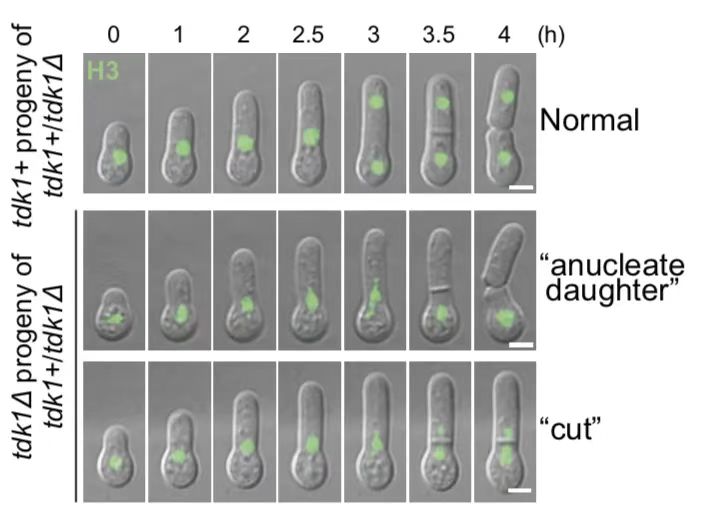 在真菌中,已知的杀手减数分裂驱动因子通常在孢子阶段表现出杀伤行为,因此被称为“孢子杀手”。然而,tdk1展现出一种新的杀伤模式。活细胞成像显示,tdk1不在孢子阶段杀伤,而是在孢子萌发后的第一次有丝分裂中显现其杀伤效果,阻碍染色体的正常分离(图2)。