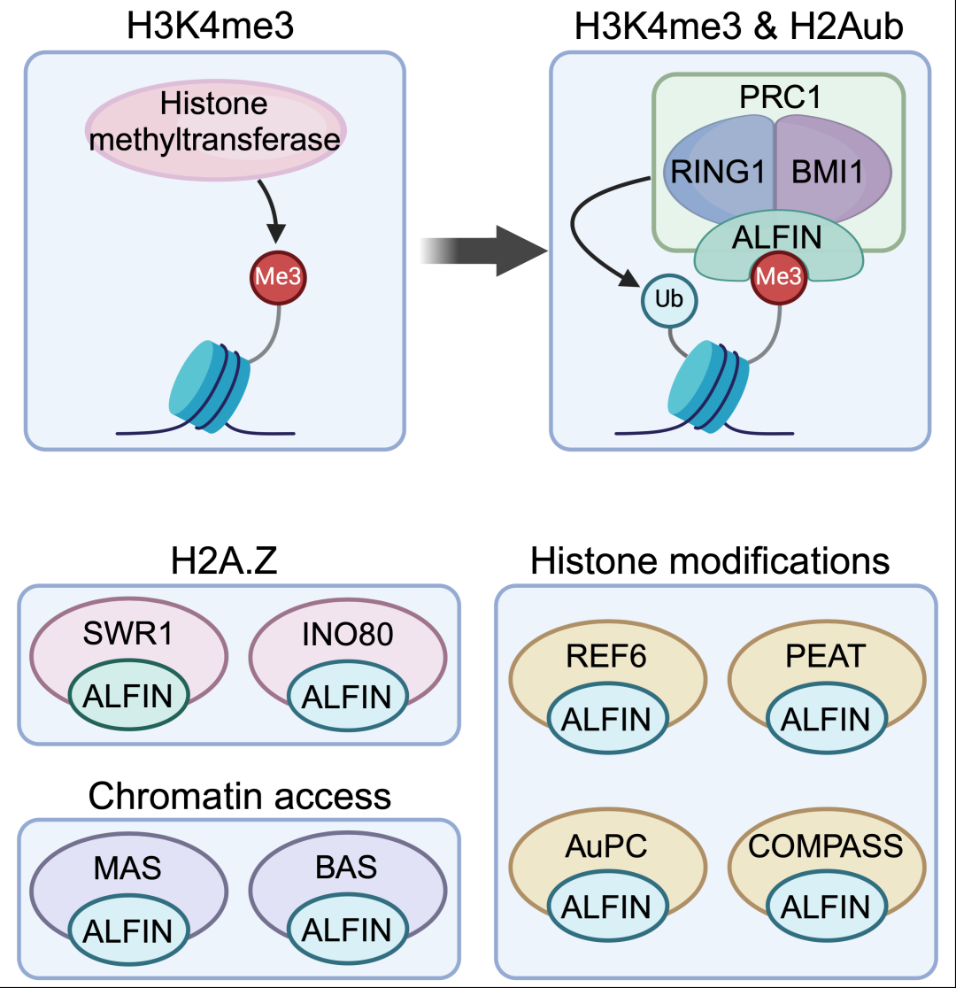 本研究发现拟南芥AL蛋白主要在全基因组水平负责促进H2Aub修饰,是PRC1复合体的植物特异亚基,在具有较高H3K4me3水平的靶基因上促进H2Aub修饰,从而抑制这些基因的转录活性状态。利用拟南芥中负责H3K4me3修饰关键酶SDG2的突变体,进一步明确了H3K4me3与H2Aub修饰之间在全基因组水平上的上下游关系,阐明了AL蛋白在偶联这两种修饰之间的关键作用。此外,本研究还发现AL蛋白能够通过与其他多种染色质相关蛋白或蛋白复合体互作用参与调控H2A.Z组装、组蛋白修饰和染色质开放,揭示了AL蛋白功能的多样性(图3)。