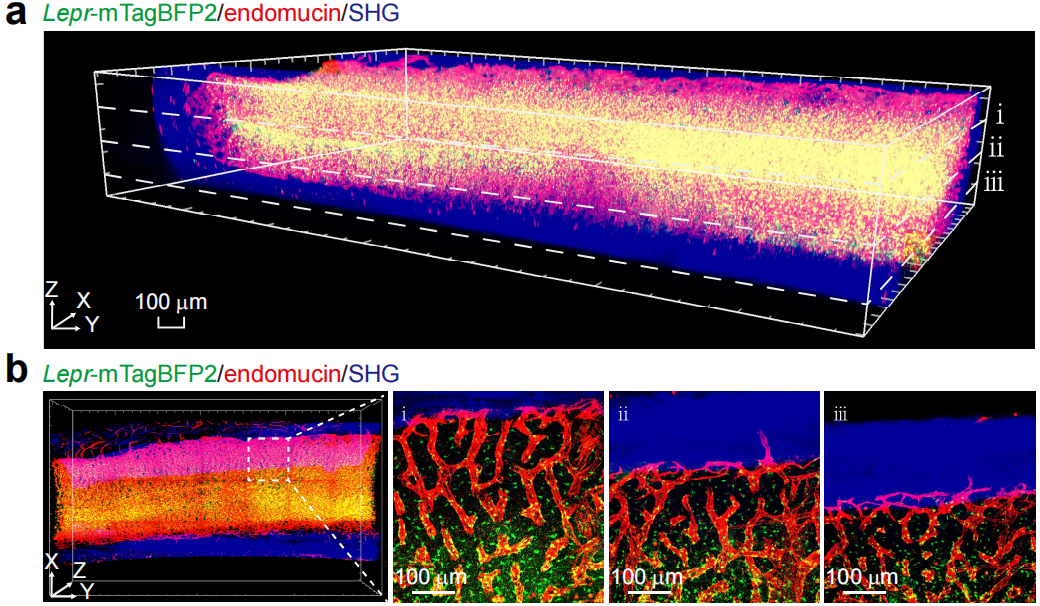 骨髓是维持成体造血干细胞(HSCs)和骨骼干细胞(SSCs)的重要场所,LepR+细胞(瘦素受体阳性间充质细胞)是成体骨髓中最重要的微环境细胞。LepR+细胞不仅分泌维持造血干细胞的关键生长因子(如SCF),而且成体骨髓LepR+细胞富集了骨骼干细胞(SSCs),可以自我更新维持并分化为脂肪细胞和成骨细胞。然而,由于骨组织的高度矿化特性,采用传统成像技术难以清晰地观察这些细胞的三维空间分布,从而限制了对骨髓微环境中细胞相互作用的研究。