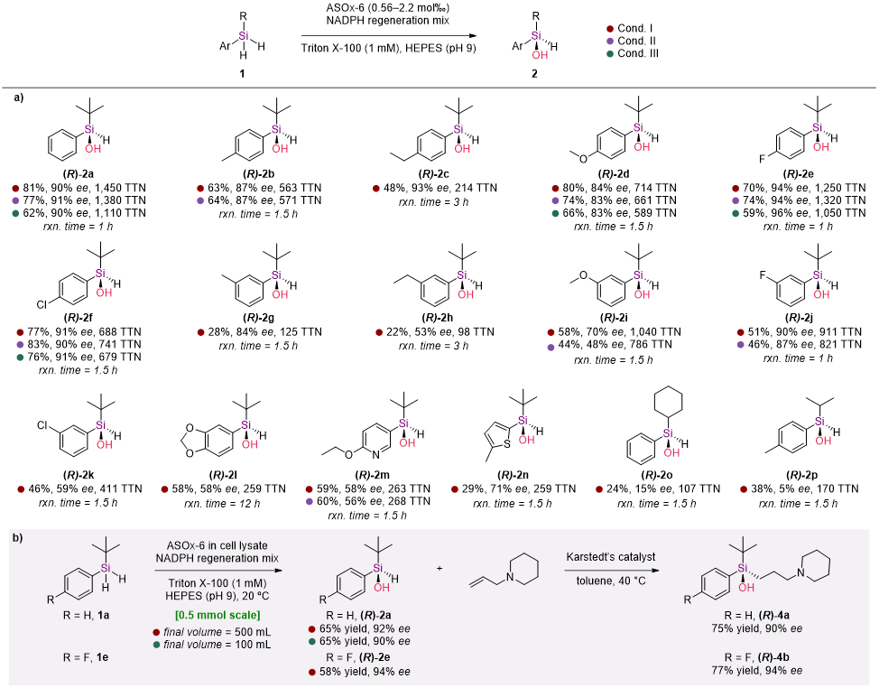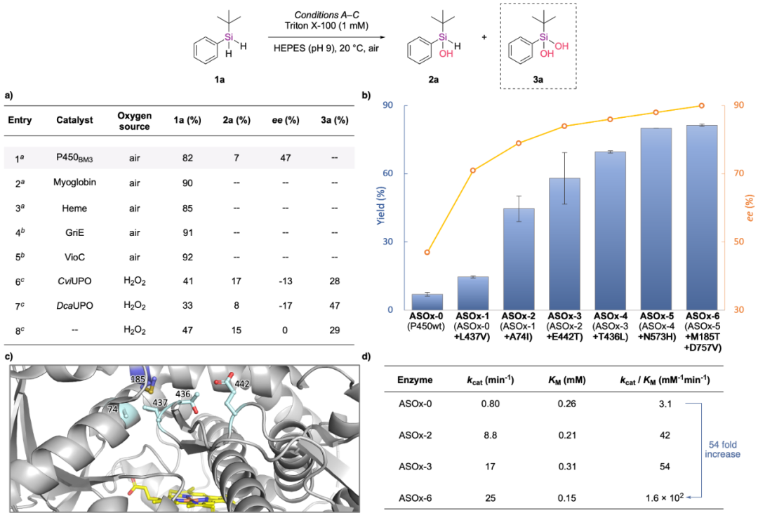 在研究的起始阶段,作者首先对于一系列碳氢键羟化酶的硅烷氧化活性进行了筛选评估。实验表明,P450氧化酶对于这一目标反应不仅具有显著的初始活性以及中等的手性选择性,更为重要的是,该催化体系中未检测到二氢硅烷过度氧化的副产物硅烷二醇3a的生成。基于这一发现,研究人员随后利用野生型P450酶作为母体,进行了多轮的定向进化。通过针对多个活性位点的定点饱和突变(site-saturation mutagenesis)以及随机突变(random mutagenesis),作者最终找到了催化这一反应的高活性突变体ASOx-6。在仅使用0.56‰酶载量的条件下,其催化模型底物的效果为81%的收率以及90%的ee值。