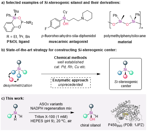 含硅有机物尤其是具有硅手性中心的化合物近年来在有机合成、功能材料及药物化学领域展现出重要的应用价值,但其生物催化合成体系的发展仍显著滞后于传统化学方法。值得注意的是,尽管硅元素在地壳中的丰度高达28.8%(以二氧化硅和硅酸盐形式存在),但生命系统对其生物利用却极为有限,仅有硅藻等少数生物进化出特异性硅代谢途径。研究如何利用酶催化过程制备或者转化含硅化合物是合成化学以及生物催化领域的热点之一。近年来,相关领域的研究已经取得了重要进展,其中代表性的工作如利用细胞色素c催化卡宾的硅氢键插入反应,以及利用细胞色素P450酶催化惰性硅氧烷添加剂中碳硅键氧化降解等等。相关的研究充分证明了酶工程在含硅化合物的制备以及转化方面所具备的应用潜力,为发展绿色可持续的硅基材料合成技术开辟了新路径。
