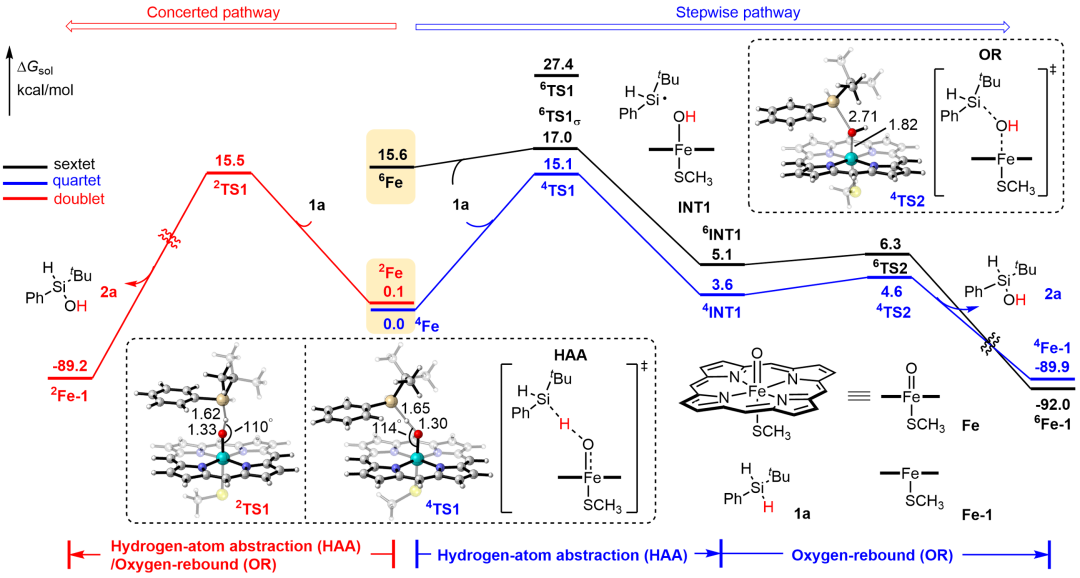 通过DFT计算,作者发现这一催化过程遵循与经典碳氢键氧化体系相似的机制,包括氢原子攫取(Hydrogen-atom abstraction)以及氧回弹(Oxygen-rebound)等关键反应步骤。计算及竞争性KIE实验确认了氢原子攫取为反应的产物决定步骤,然而由于硅氢键的键能显著低于普通的碳氢键键能,在这一硅烷氧化体系中,该步骤并非反应的决速步。分子动力学模拟对比显示:野生型P450BM3与最终变体ASOx-6的近攻击(near-attack)构象中,底物的pro-R氢原子均保持与铁氧中间体较近的距离,而关键突变使pro-S氢在突变体中与氧中心的平均距离增加。这一变化直接决定了最终变体对于该反应更优的对映选择性。