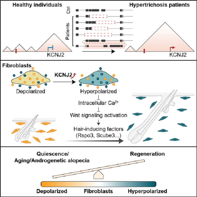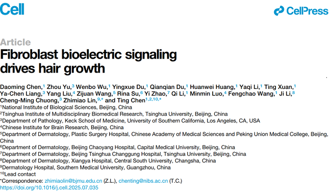 2025年8月15日,北京生命科学研究所/清华大学交叉医学研究院陈婷团队在《Cell》期刊在线发表了题为“Fibroblast bioelectric signaling drives hair growth”的研究论文。该研究首次发现,皮肤成纤维细胞的膜电位状态是毛发再生的关键调控因素:超极化促进毛发生长,而去极化则抑制毛发生长。在先天性多毛症患者中,染色体构象变化导致KCNJ2基因在成纤维细胞中特异性上调。进一步机制研究表明,KCNJ2的上调引起膜电位超极化,从而通过降低细胞内钙浓度增强Wnt信号响应,最终促进毛发再生。此外,KCNJ2介导的超极化在雄激素性脱发及老年小鼠模型中同样可以促进毛发生长,显示出良好的临床应用潜力。