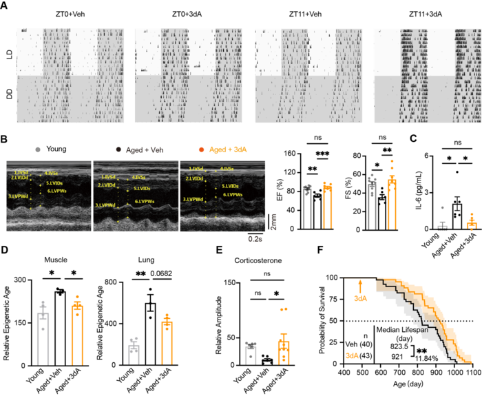 在早期研究中,团队通过化学筛选、遗传筛选与结构生物学分析发现,3dA 可直接靶向 RUVBL2 蛋白,调控生物钟的相位与振幅;随后研究进一步证明 RUVBL2 是核心生物钟复合体的重要组分,其调控机制在物种间高度保守。在此基础上,本研究首先在代谢紊乱所导致节律振幅降低的模型中评估了3dA的干预效果。结果显示,3dA呈现出一定的相位依赖性作用特征。在节律振幅明显衰退的15月龄老龄小鼠中进行3dA干预及系统表型评估发现,其效应同样具有时相差异:ZT11给药可增强小鼠活动节律,而ZT0给药效果相对有限。多系统功能评估结果表明,3dA处理能够改善代谢稳态,提升认知与运动能力,优化心血管功能,延缓多系统功能衰退,产生延长寿命的效果。